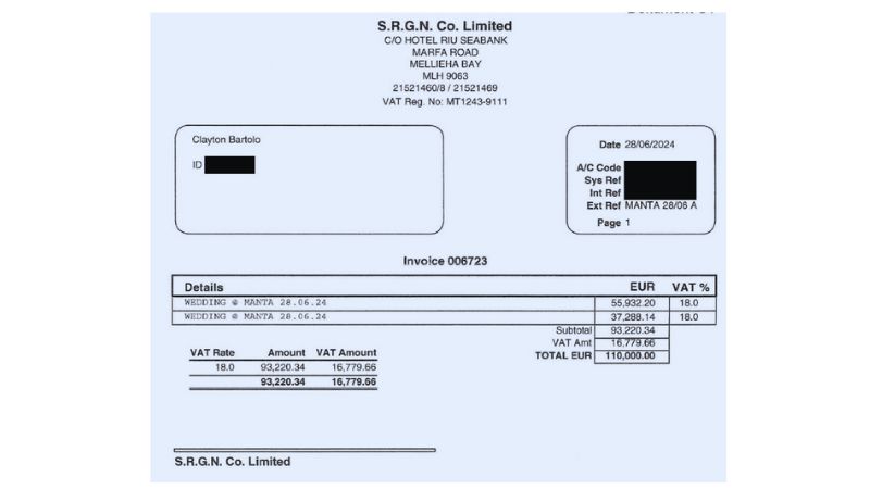 Bartolo produced two bills, one of €110,000, for the use of the Tigné lido and all the catering and drinks required for his wedding. Another €14,000 was paid to Chris Galea – described as a logistics expert – who handled the hiring of a barge and boats to transport the Minister’s guests between Manoel Island and his reception venue in Tigné.